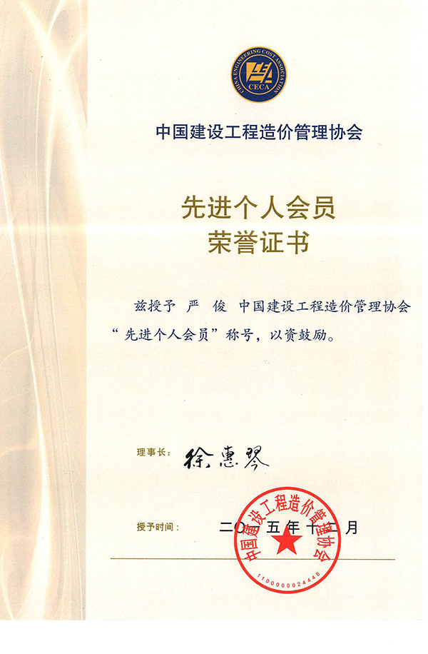 公司榮獲中國建設工程造價管理協(xié)會“2014年度先進單位會員”稱號,湖北分公司經理嚴俊榮獲“先進個人會員”稱號。